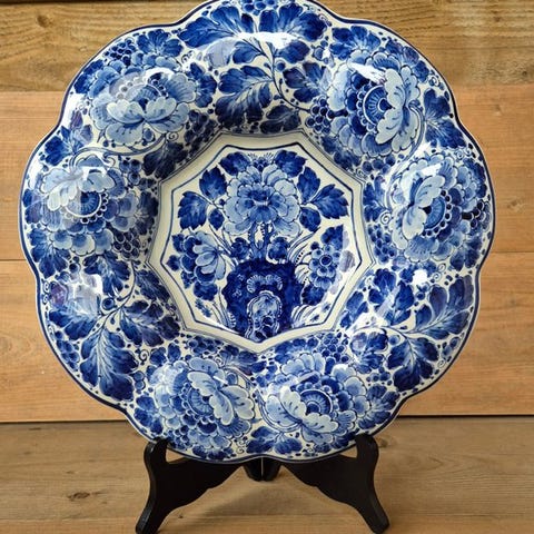 Interiøret viser tydelige tegn på alder og betydelig slitage på sølvpladen, hvilket blotlægger det underliggende kobber forskellige steder, især inde i fadet og på hævede dekorative sektioner. Disse brugsspor giver stykket en autentisk antik karakter. Trods sliddet forbliver varen strukturelt solid og fuldt dekorativ uden