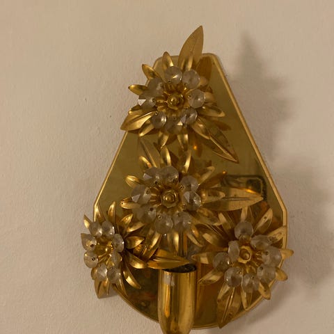 Smuk håndlavet vintage-væglampe i blomsterdesign – guldfarvet forgyldt bladguld krystalglas – med bladdekoration og krystal-elementer