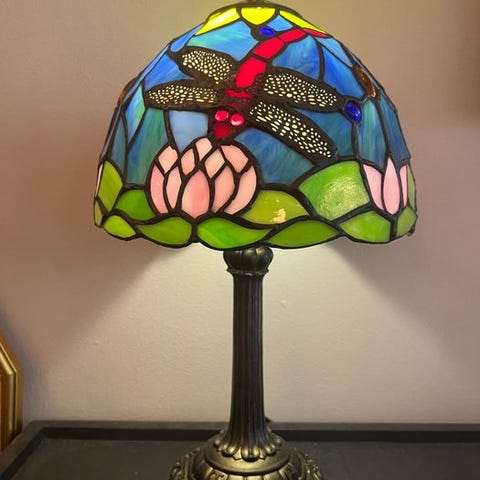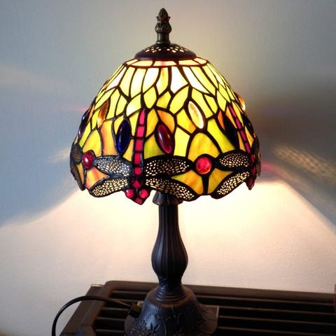 Oplyst dit rum med et strejf af elegance og eksklusivitet! Denne smukke, håndlavede Tiffany-lampe er inspireret af det enkle design 'Dragonfly' fra Tiffany Studios New York, og er en sand skulptur i ethvert interiør.