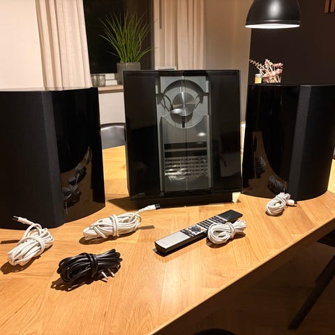 Beosound 3000 fuldt sæt med AUX-tilslutning til trådløs streaming af Spotify, Deezer osv., plus et sæt meget smukke, kraftfulde aktive Beolabs 6000 med naturligvis gode woofers.