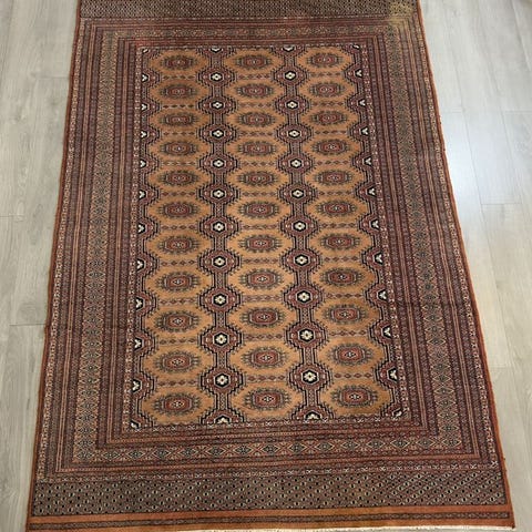 Oprindelse Pakistan, håndknyttet Buchara tæppe, 235 × 173 cm, 100% naturlig uld på bomuldbase, i rigtig god stand. Klik på den blå "gå til varen" knap, for at købe eller byde på denne vare. Den samlede pris vil blive vist inden du afgiver dit bud.