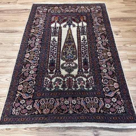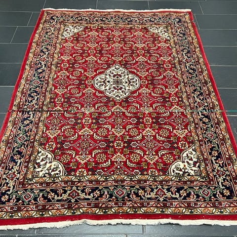 Håndfletet Ghom Royal Kaschmir tæppe fra Pakistan, måler 1,30 x 1,80 m, uld på uld, beige og rosa i flerfarvet mønster, vægt 10 kg, i særdeles god stand, fra slutningen af det 20. århundrede. Klik på den blå "gå til varen" knap, for at købe eller byde på denne vare. Den samlede pris vil blive vist inden du afgiver dit bud.