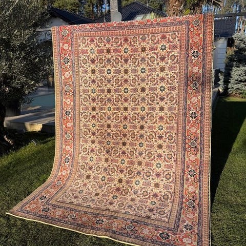 Tæppe fra Indien, håndknyttet med fine uld. Til dets konstruktion blev den tibetanske teknik anvendt, hvor knytningen er over vævet og tråden i bomuld.