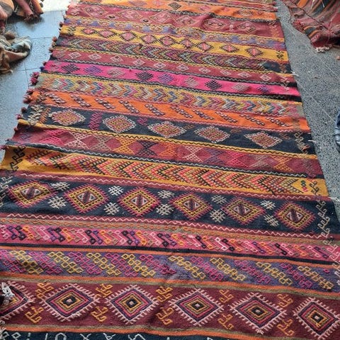 Dette håndvævede vintage kilim blev lavet i 70'erne-80'erne af nomadiske folk i Banaz landsby. Før selve vævningen begyndte, klippede væveren sine får, rensede, kæmmede og spandt ulden for at få det bedste garn til kilimét. Vævning af tæpper er en tradition i Tyrkiet, og hver landsby og stamme har forskellige design- og vævetraditioner. Dette tæppe har karakteristiske farver og en karakteristisk designkombination.