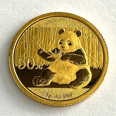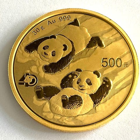 Kinesiske Pandabjørne er en af de få bullion-mønter i verden, der skifter design hvert år! I Brilliant Uncirculated-tilstand begyndte den højt samlerobjektive Gold Panda-serie af mønter i 1982. Hver størrelse i Gold Panda-kollektionen er 0,999 ren guld. Den traditionelle forsidesdesign viser Hall of Prayer for Abundant Harvests i Temple of Heaven i Beijing.
