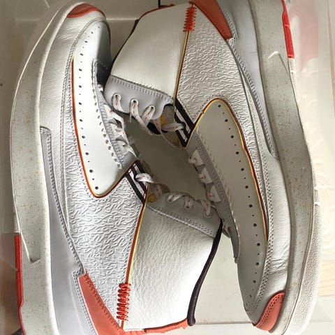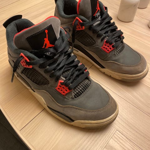 Air Jordan sneakers i grå, rød og sort farve. Materialet er primært ruskind med detaljer i sort og rød. Skoene har sort snørebånd og rød inderside. Sålen er sort og hvid med røde detaljer. Designet er unisex.