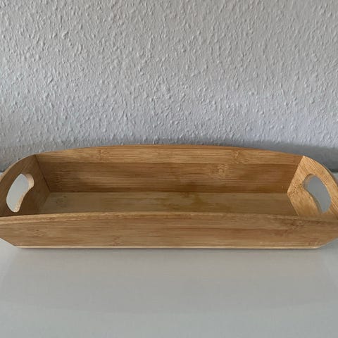 Gammel træbakke i bøg, med svungne håndtag i træ og metal, en såkaldt pillebakke.