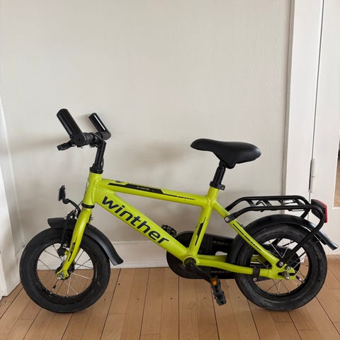 Winther børnecykel med 12" hjul, grøn farve. Cyklen er designet til børn og har et stel i passende størrelse til små ryttere.