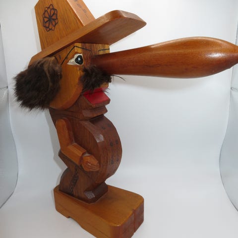 Træ-legefugl med tandlæge-magiker-nisseknækker på træstand. Ca. 30 år gammel.