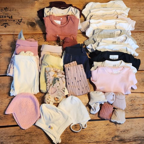 En fin lille pakke med x2 helfragter x 6 kortærmede og x 6 langærmede bodier x2 bukser x1 trøj mm