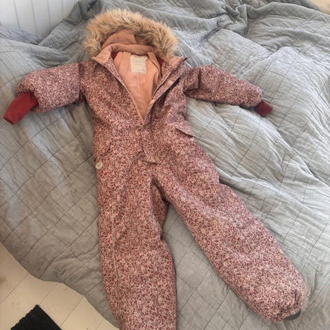Wheat flyverdragt i multifarvet (rosa/brun) til pige i størrelse 86. Flyverdragten har hætte med aftagelig pelskant og lukkes med lynlås. Designet til at holde barnet varmt og beskyttet i koldt vejr.