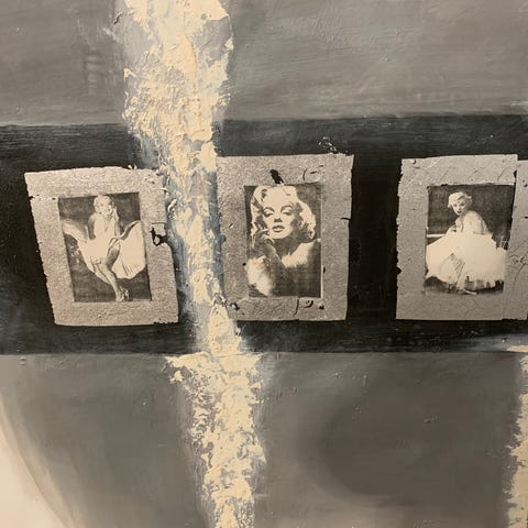 Portrættegning af Marilyn Monroe med sort-hvid skitse og lilla maling på nederste del. Kunstværket kombinerer klassisk portrætkunst med moderne farveelementer.