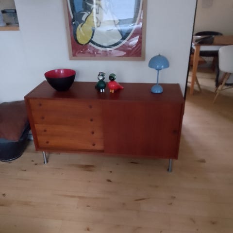 Skænken er produceret i fineret teak, med eftermonteret ben.