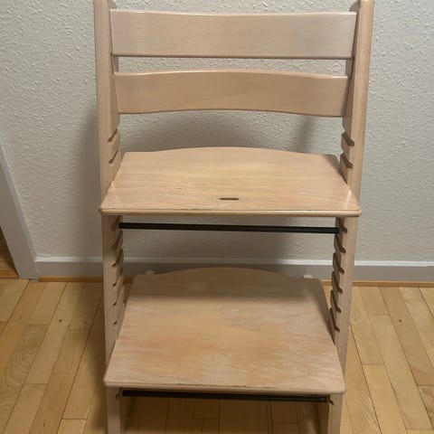 Tripp trapp Stokke Højstol i træ. Højstolen er designet til børn og har en justerbar fodstøtte og sele til sikkerhed. Fremstillet i lyst bøgetræ træmateriale.