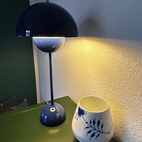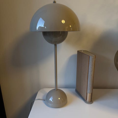 &Tradition Verner Panton bordlampe i pink farve. Lampen har et rundt skærmdesign og en slank fod, hvilket gør den velegnet til brug som dekorativ belysning i hjemmet.