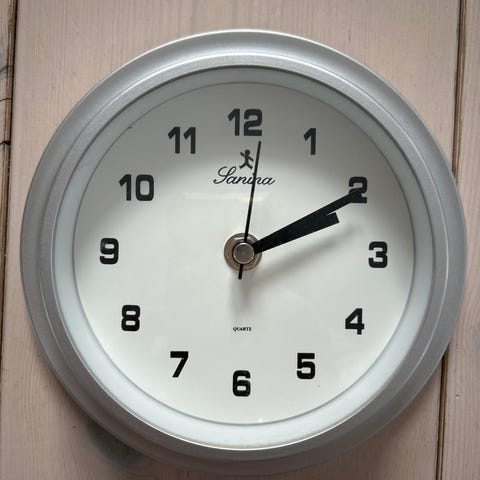 Huygens vægur. Måler 35 cm i diameter og 6,2 cm i dybde. Lydløst urværk. Bruger 1 AA batteri.