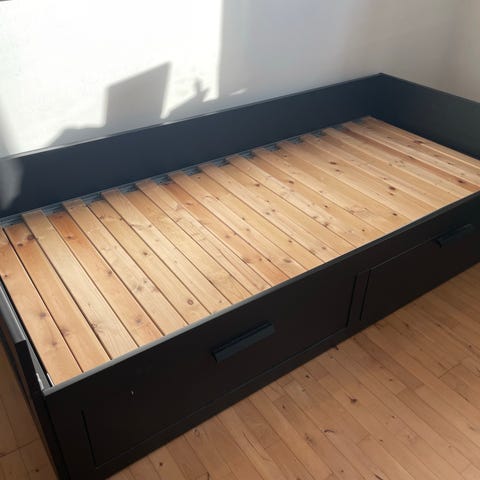 IKEA brimmes seng med opbevaringsskuffer i sort farve.