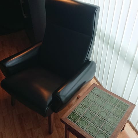Lækker lænestol med god komfort og dejligt roligt udseende. Brugsspor, men ikke noget der betyder noget for komforten.