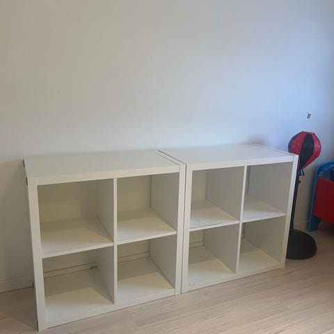 IKEA børn møbel reol med fire rum og opbevaringskasser isort og hvid. Reolen er udført i hvidt materiale og indeholder både sorte og hvide stofkasser til opbevaring. Velegnet til børneværelset til organisering af legetøj og andre småting.