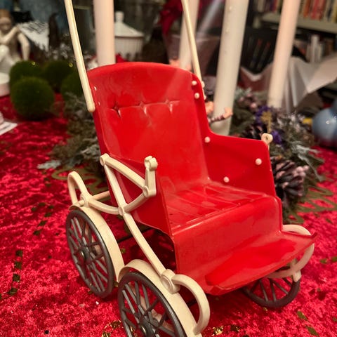 Antik dukkevogn i flet med sort stof