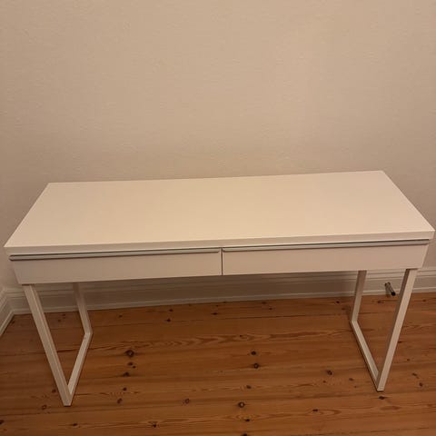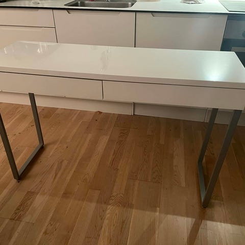 Bordet er i okay stand med tydeligere brugsspor på bordplade, noget mere synligt end andet og skufferne er medtaget - bordet fungerer dog som det skal. Send gerne bud
