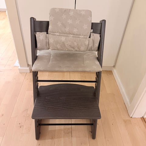 Stokke Trip Trap højstol i sort træ (ny model) købt i 2020, nypris ca. 1200 kr. Velholdt, med alm. brugsspor, klar til brug. Kan ikke sendes, men ses og prøves på Sluseholmen, 2450 KBH SV.