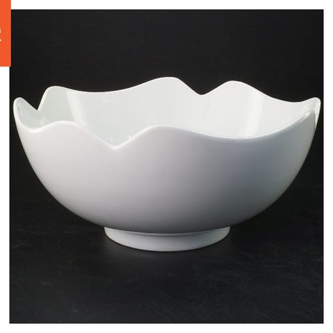 En hvid porcelænsskål med låg, som måler 25 cm i diameter og 6 cm i højde. Skålen har to håndtag på siderne og et dekorativt håndtag på låget, der gør det nemt at løfte. Den har en klassisk og elegant design, ideel til servering eller opbevaring af madvarer. Skålen og låget er glaseret, hvilket giver en blank overflade.