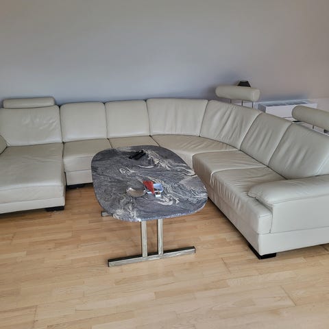 9 personers modul hjørnesofa i kraftig rød læder. Er siddet godt til og har lidt mærker efter hund og kat