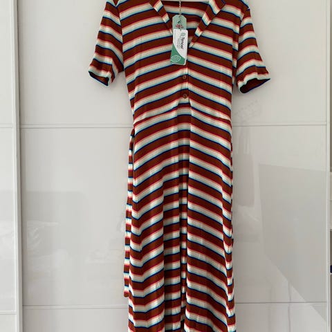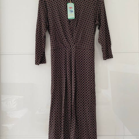 Ny med prismærke. Trekvart ærmer og bælte samt rund hals. 95% viskose og 5% elastan. Størrelse L. Nypris 830 kr.
