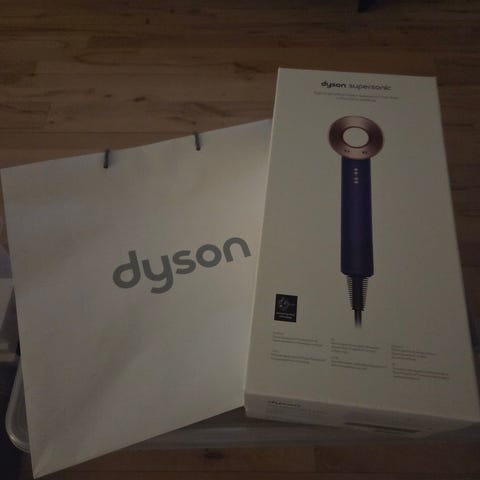 Dyson Supersonic hårtørrer med flere udskiftelige tilbehør, herunder koncentratorer, diffuser og stylingredskaber. Enheden har en moderne design med en kombination af grå og pink farver.