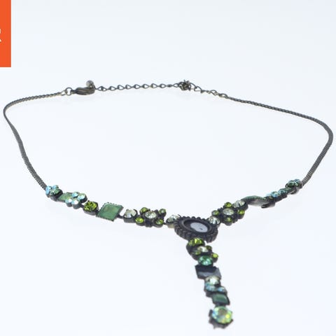 Denne halskæde har en længde på 68 cm og består af en mørkegrøn snor dekoreret med perler og charms. Der er forskellige charms med hjerte-, kogle- og udsmykkede metalliske former. Perlerne er farvet lilla og grønne og tilføjer et farverigt touch til halskæden.