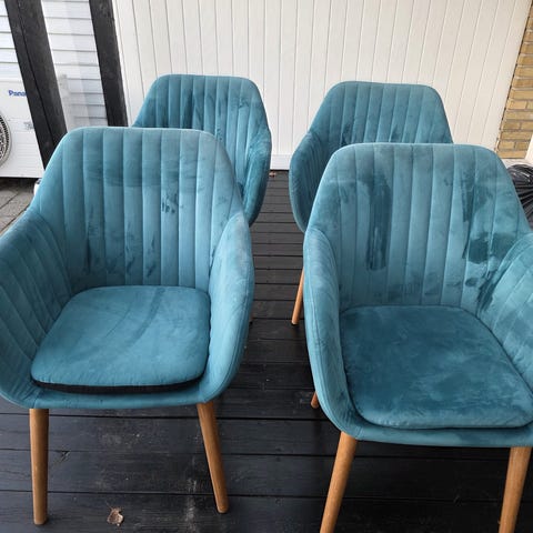 Sælger 4 stk. Emilia spisestole i flaskegøn velour med ben i eg.