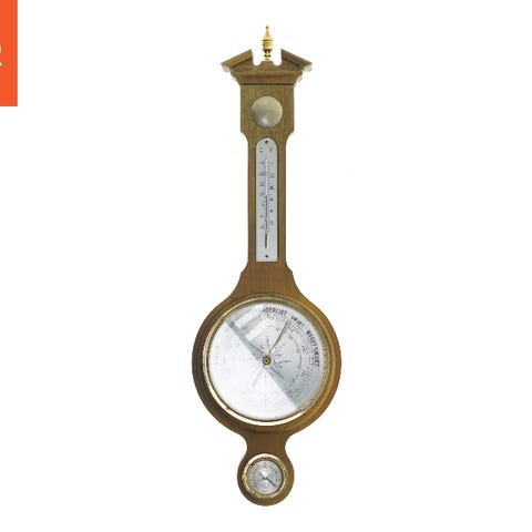 Messing barometer med en størrelse på 6x18 cm. Barometerets hovedfunktion er at måle lufttryk og vise vejrændringer som angivet på skiven med ord som 'REGN' og 'FORANDERLIGT'. Det har et klassisk design med en hvid skive og metalhylster.