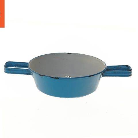 En blå emaljeret si med dobbelte håndtag på hver side. Sien har en diameter på 19 cm og er perforeret med små huller i bunden, ideel til dræning af vand fra madlavning.