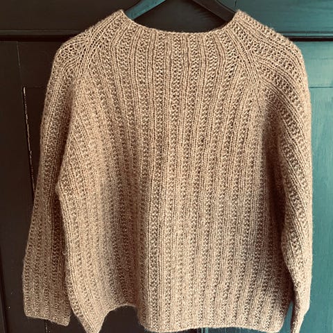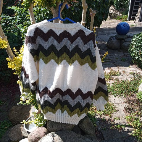 Jeg har strikket sweatre i uld med nordiske mønstre og I-cord afslutning i halsen.