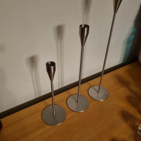 Sæt af tre lysestager i rustfrit stål med enkle og moderne design. Lysestagerne varierer i højderne 14,5 cm, 21,5 cm og 29,5 cm. De har en rund base, der giver god stabilitet og er egnet til slanke stearinlys. Undersiden har en sort belægning for at beskytte overflader mod ridser.