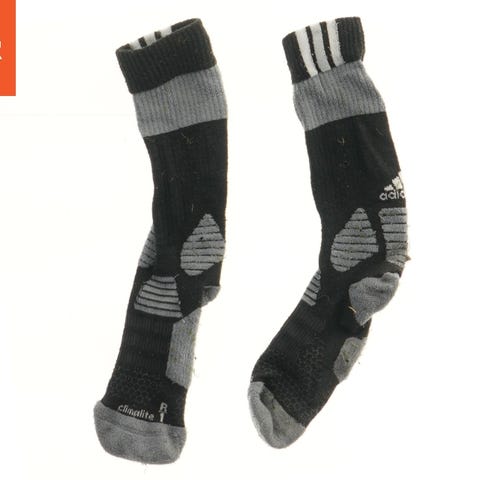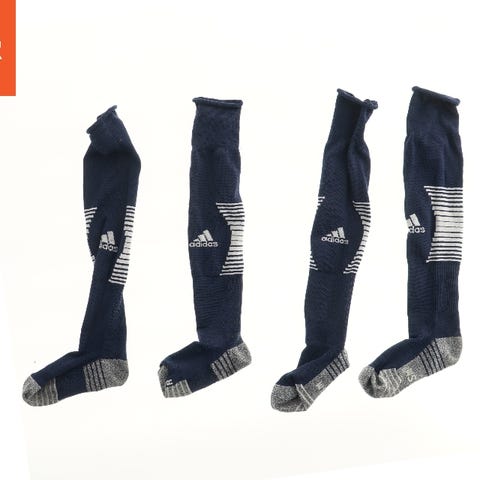 Et par blå strømper, designet til fodbold. Lavet af elastisk materiale med ribbet struktur, der giver en tætsiddende pasform. Størrelsen er 23,5 cm fodlængde. De er velegnet til sport som fodbold og andre boldspil.