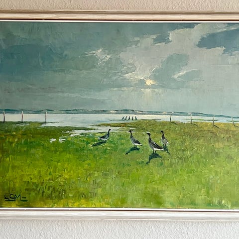 Ænder over brænding. Signeret og indrammet. Rammemål cirka 45 x 35 cm. Kan sendes med GLS til en pakkeshop for 53 kroner.