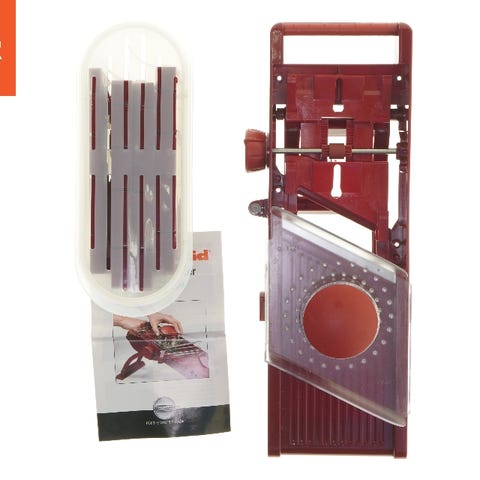 Dette er et mandolinjern til skæring af grøntsager. Det kommer med en opbevaringsboks til ekstra blade og en instruktionsmanual. Mandolinjernet er ideelt til at lave ensartede skiver af forskellige grøntsager. Der er justerbare indstillinger for tykkelse og en sikkerhedsholder til håndtering af maden.