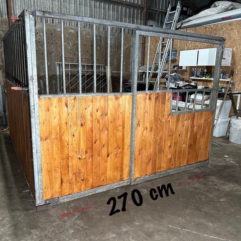 3 hestebokse med skydelåger. 3 fronte inkl låge, og 3 sider. Kan sættes i forlængelse af hinanden, såfremt den ene står mod en væg, eller 2 og 1 såfremt 2 af dem står mod en væg. Der er spist af træet, og spist hul i den ene side på størrelse med en fodbold.