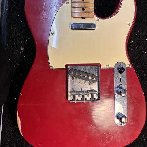 Kroppen er oprindelig en Fender Noventa, hvor der er fraset ud til en neck pickup samt en fuld nylakering i Lake Placid Blue, som efterfølgende er faded og aged/relic'd - hos en professionel, ikke af mig:-)