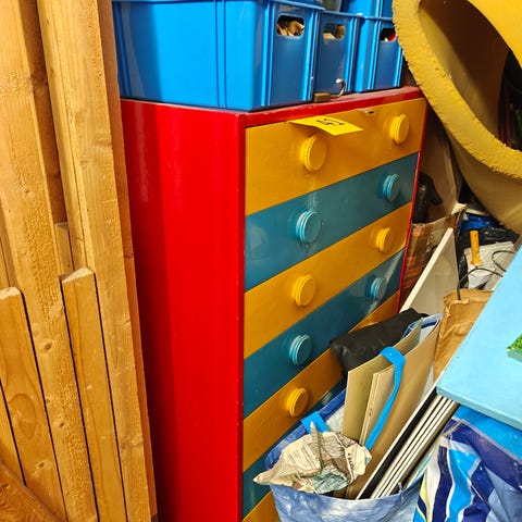 Ådremalet kommode med 4 skuffer i front. Aldersrelateret slid og patina. 90 x 88 x 49 cm.