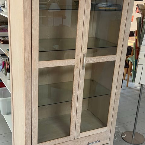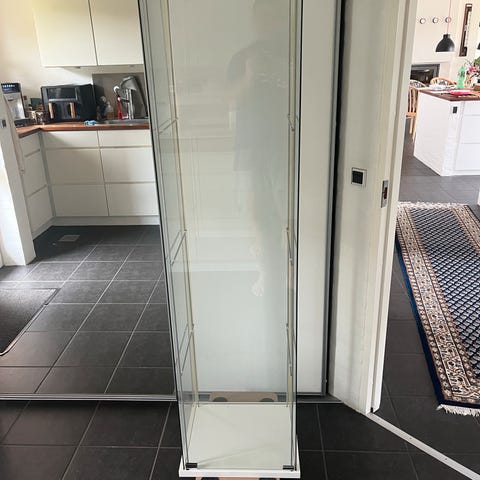Vitrineskab i glas og træ med lys det er 177 cm højt 67 cm bredt og 33 cm dybt .Det er i pænt stand se billederne som er en del af beskrivelsen
