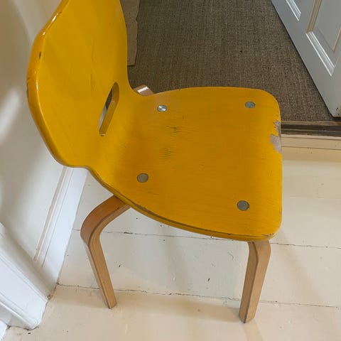 Skøn børne stol fra vintage IKEA designet af Alvar Aalto i fed gul farve. Det mangler et par skruer hist og pist, men når de er sat i fungere stolen/stolene super fint.