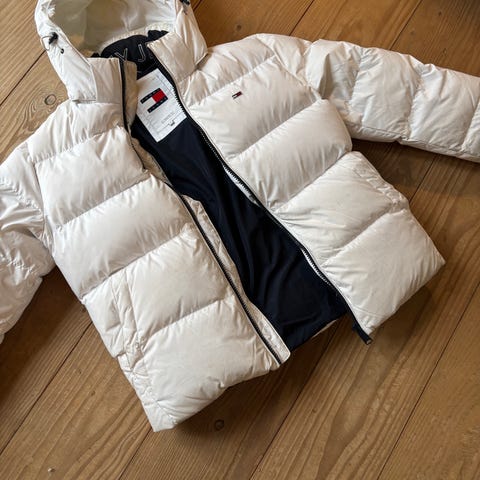 Tommy Hilfiger vinterjakke i størrelse XL. Jakken er grøn og fyldt med dun, hvilket giver isolering og varme. Designet til mænd og egnet til udendørs brug i kolde vejrforhold.