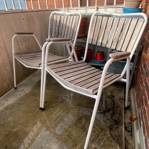 Jeg sælger 3 marguerit-stole. De er originale og i ægte retro-look, perfekt til haven, sommerhuset eller som et unikt indslag på terrassen. De kan stables og vi har brugt dem rundt om vores bålsted 🔥