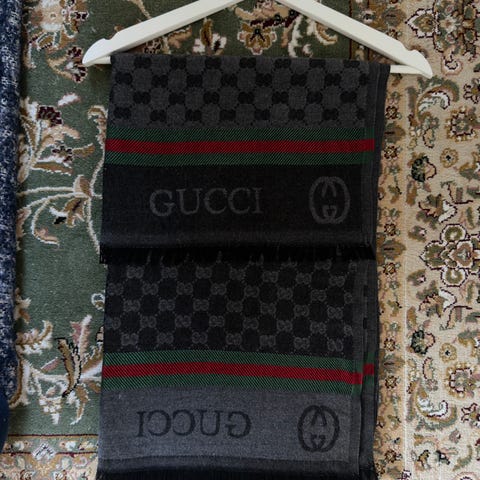 Gucci uld tørklæde i grå farve, størrelse one size. Fremstillet i uldmateriale, designet til mænd og damme Tørklædet har et mønster med Gucci-aldrig brugt , mål 49+180