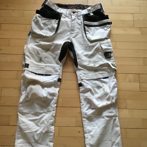 Malerbukser/murebukser i hvid farve. Bukserne er fremstillet i slidstærkt materiale med forstærkninger og flere lommer til opbevaring. Velegnede til arbejde, der kræver holdbart og funktionelt arbejdstøj.