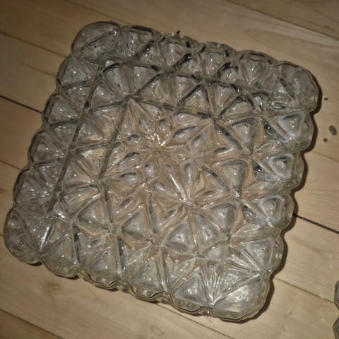 vintage krystalplafon eller væglampe, som ofte findes i dansk design fra 1960'erne eller 1970'erne. Plafonden har et karakteristisk facetteret mønster, der reflekterer lyset smukt.