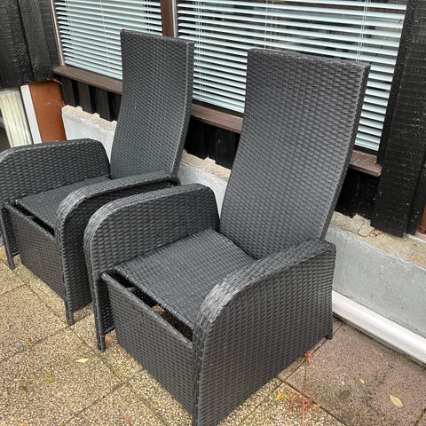 Havemøbelsæt bestående af 2 stole med sort fletramme og polstrede sæde- og ryglænspuder. Sættet inkluderer stole med fodstøttefunktion.